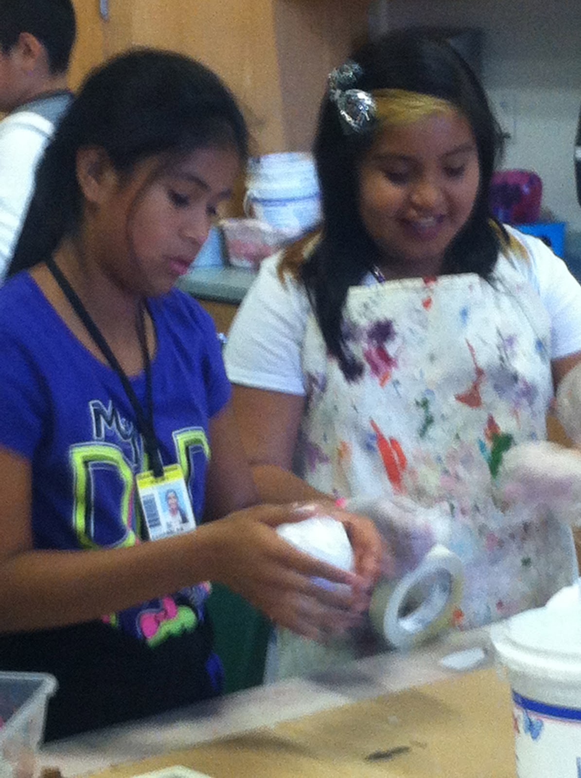 For Dia de Los Muertos we created small papier mache skulls. Students learned about the art elements form and color and the design principle of pattern. Some even came in during activity time to make more on their own time when class was over!